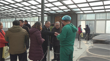集團總經理周明臣向參觀老人介紹陳醋原料