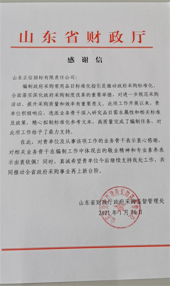 2021年1月20日,山東正信招標(biāo)有限責(zé)任公司收到山東省財(cái)政廳采購(gòu)監(jiān)督管理處的感謝信,主要內(nèi)容是對(duì)正信招標(biāo)公司積極參與2021年山東省政府采購(gòu)常用品目標(biāo)準(zhǔn)化指引和品目清單工作表示感謝。